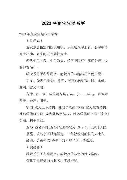在给宝宝取名时,以兔宝宝为主题是一个很好的选择。这些名字往往很可爱,激发了每个人的创造力。然而,命名不仅要关注名字的可爱性和风格,还要深入思考名字背后的文化内涵。这些深入的思考可以使名字具有更深层次的意义,更符合当代的审美标准。希望家长在给孩子取名时,注意避免清晰,遵循文化内涵和规范的原则,给孩子取个好名字。
